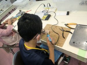 接着剤で電池ボックスをボードに固定したり、カッターナイフで袋を切ったり