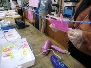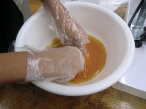 ベニバナから染料を取り出してハンカチを染めてみました。きれいな模様が出来たかな?