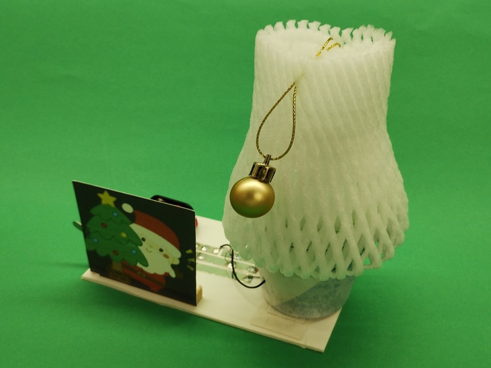 電子部品を使って、スイッチを入れるとスピーカーからクリスマスソングが流れ、緑・橙・赤色に変化する光のオブジェを作ります。