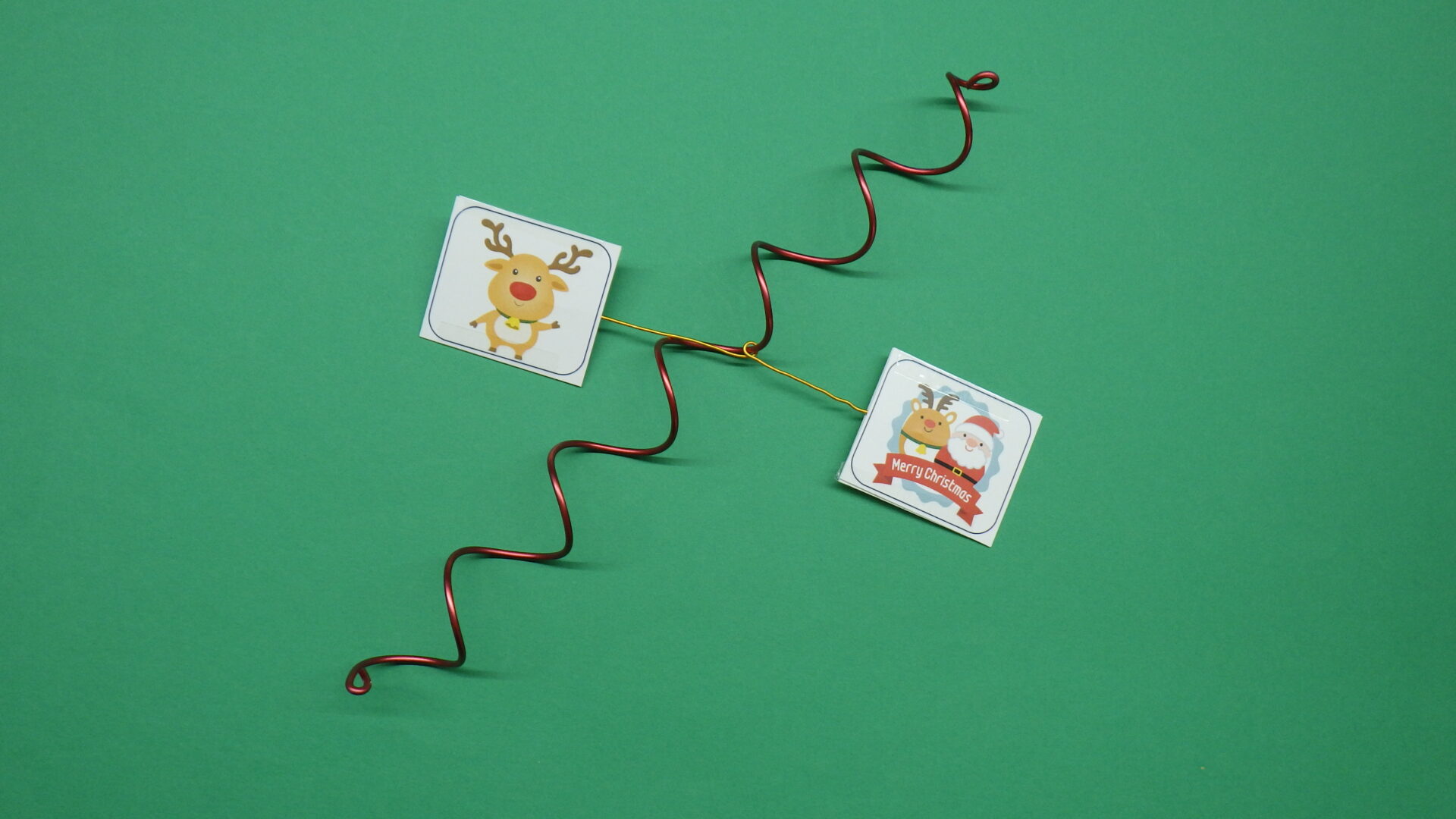アルミの針金でらせんをつくり、サンタとトナカイのイラストがらせんを伝わってクルクルまわりながら下にきて、
