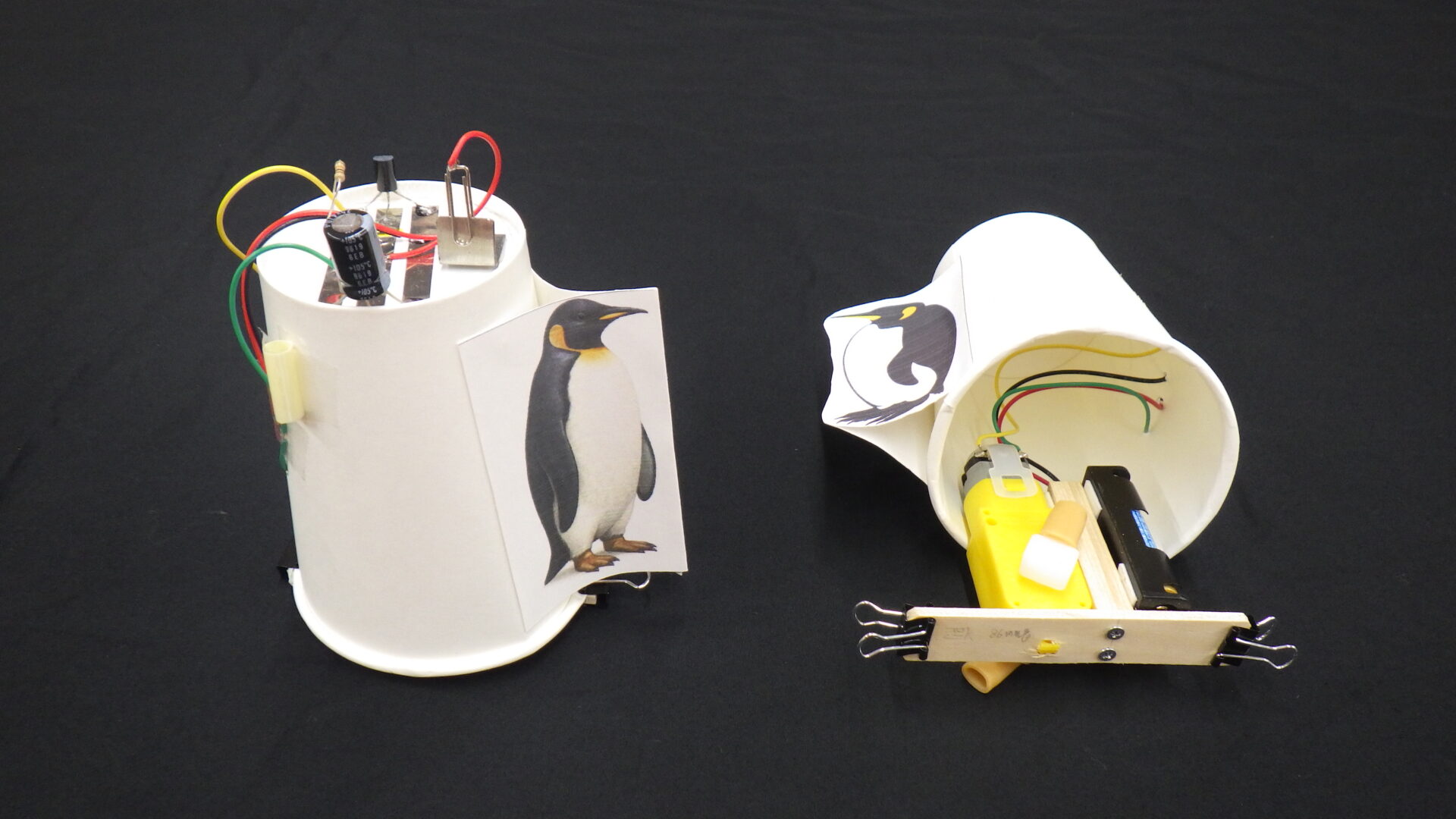 磁石の信号でモーターが回る電子回路を組みたて、ペンギンの絵を貼った紙カップの中に組み込みます。これに磁石の信号を与えるとノコノコ歩き出します。