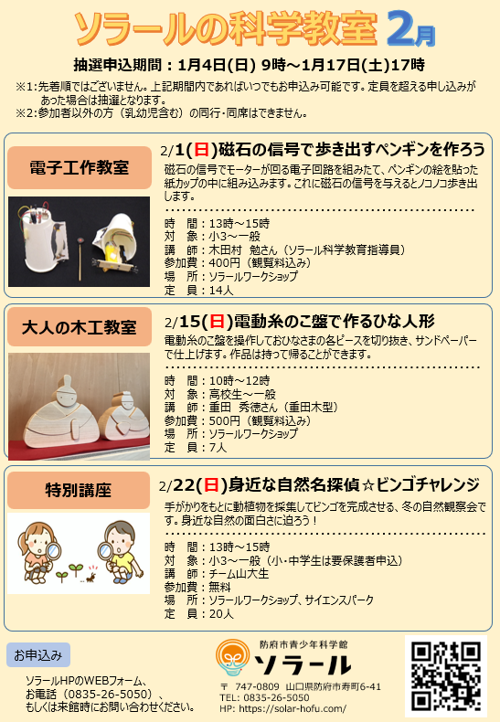2月開催の科学教室のお申込みを開始しました。